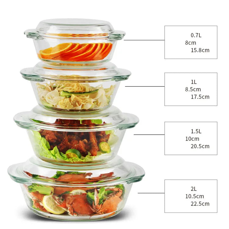 Glass Bowl Durable glass bowl with matching lid, available in four sizes: 2000 ML, 1500 ML, 1000 ML, and 700 ML. Perfect for storage, meal prep, and serving. Airtight seal keeps food fresh. Transparent design for easy visibility.